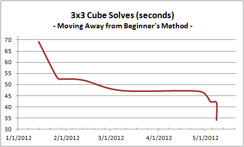 The sharp quick drop followed by a long tail is really clear evidence of the steep learning curve. That phenomenon is also evident in this more narrow data set of my progress after starting to migrate seriatim away from Beginner’s Method (with the last drop after learning more OLLs/PLLs):